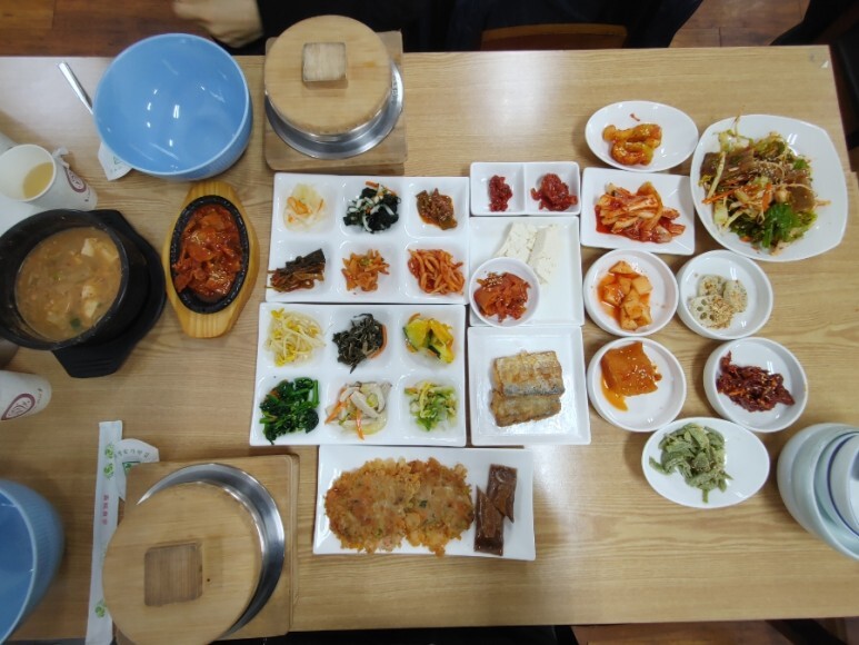 생선류, 제육, 전병, 청국장찌개가 나와요.