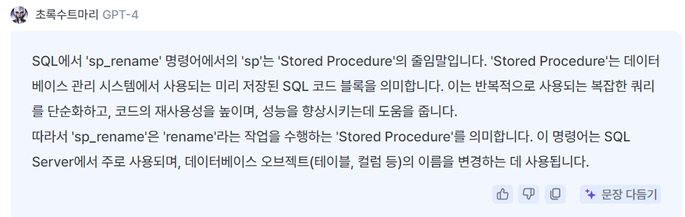 SQL에서 'sp_rename' 명령어에서의 'sp'는 'Stored Procedure'의 줄임말입니다. 'Stored Procedure'는 데이터베이스 관리 시스템에서 사용되는 미리 저장된 SQL 코드 블록을 의미합니다. 이는 반복적으로 사용되는 복잡한 쿼리를 단순화하고, 코드의 재사용성을 높이며, 성능을 향상시키는데 도움을 줍니다. 따라서 'sp_rename'은 'rename'라는 작업을 수행하는 'Stored Procedure'를 의미합니다. 이 명령어는 SQL Server에서 주로 사용되며, 데이터베이스 오브젝트(테이블, 컬럼 등)의 이름을 변경하는 데 사용됩니다.