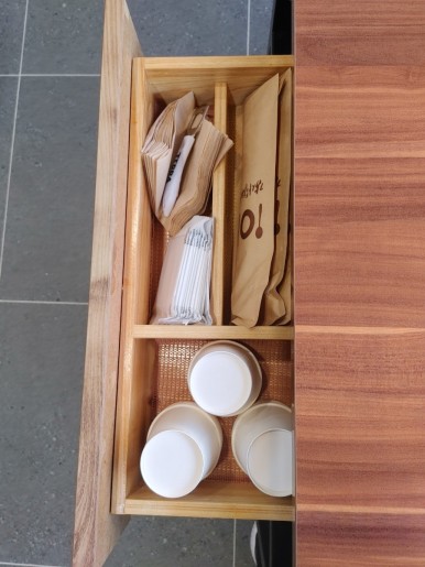 테이블 수납장에는 식기류와 물컵, 티슈 등이
