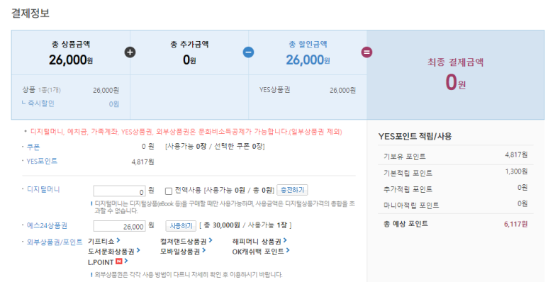예스24는 외부상품권이나 포인트로도