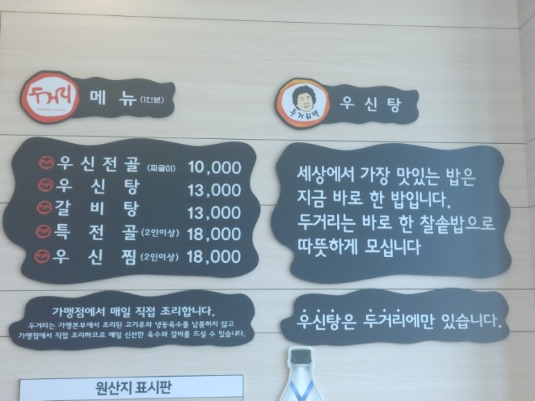 대표 메인 메뉴는 우신전골, 우신탕, 특전골, 우신찜이구요.