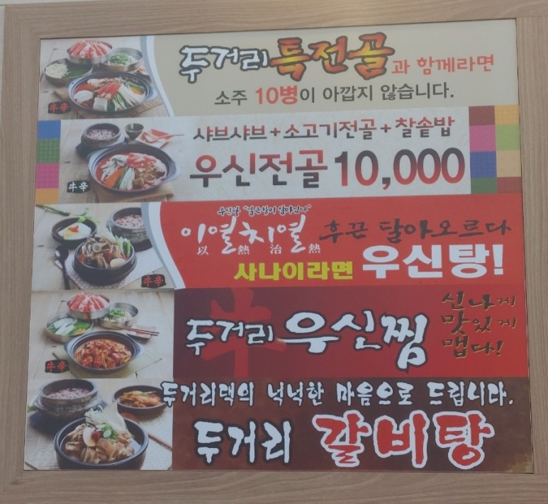 대표 메인 메뉴는 우신전골, 우신탕, 특전골, 우신찜이구요.