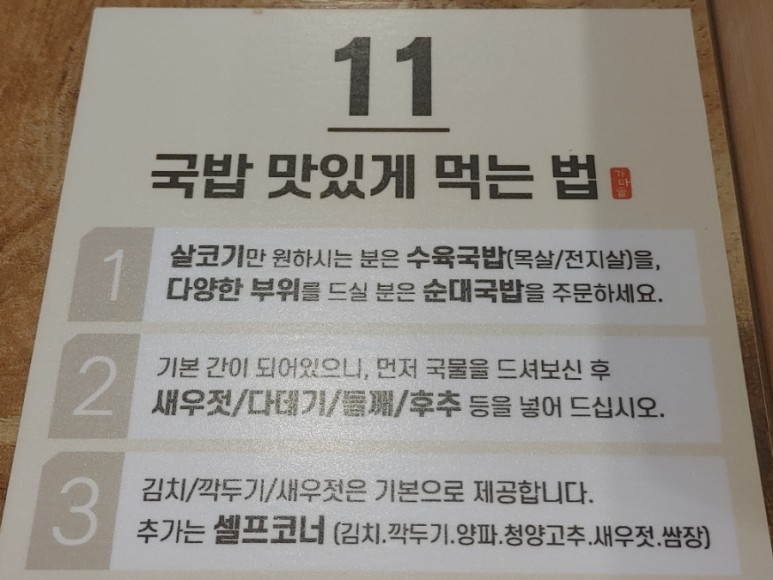 테이블마다 국밥 맛있게 먹는 법이 붙어있어요.