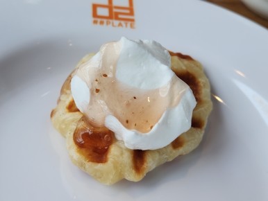 와플에 생크림과 딸기쨈이 올라가있구요.