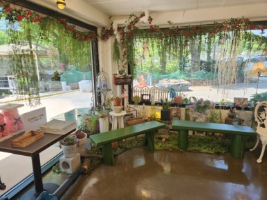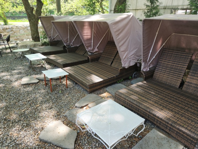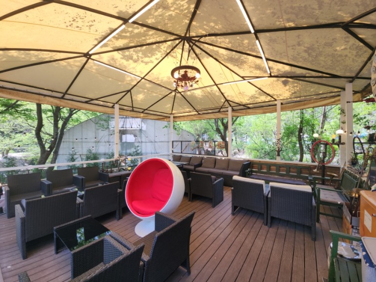 야외인데 위에 대형 천막이 햇빛을 가려줘요.