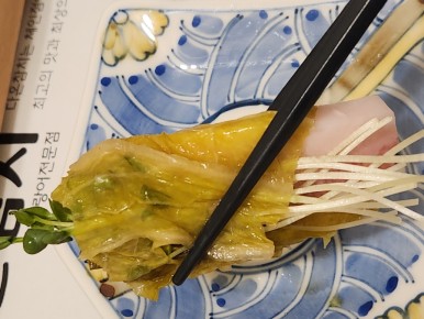 신선한 참치회를 김이랑 백김치에 싸서