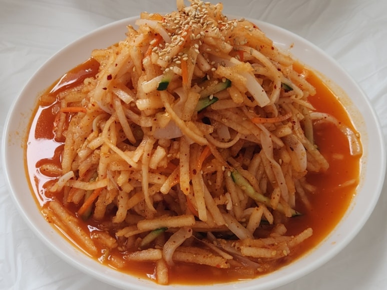 오징어, 무, 배, 오이, 당근 등이 들어가 있어요.