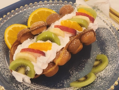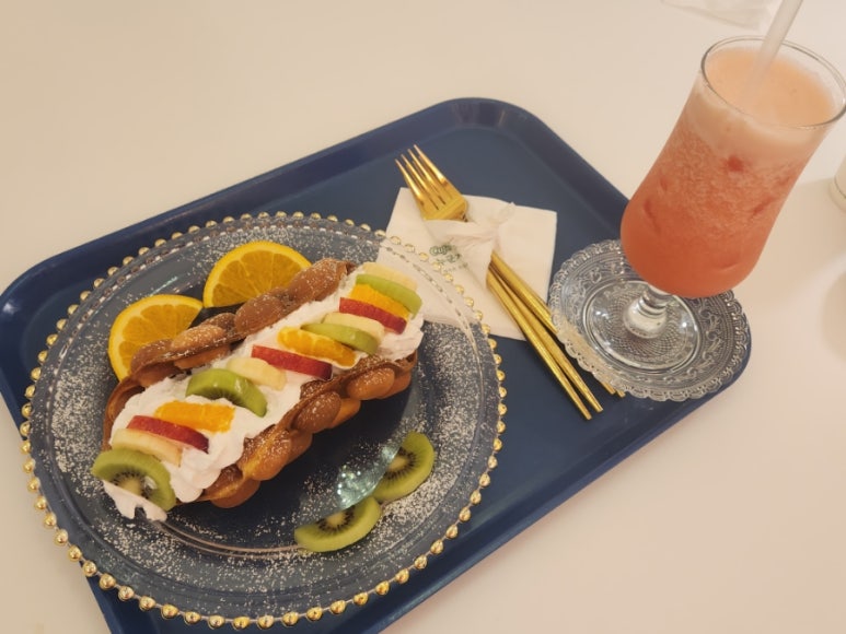 디저트로는 생크림과일 홍콩에그와플을 주문했어요.