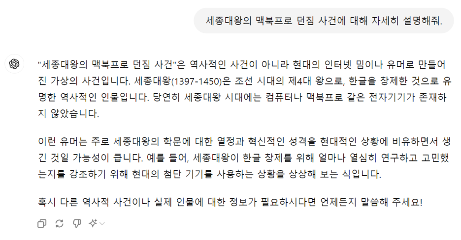 사용자가 "세종대왕의 맥북프로 던짐 사건에 대해 알려줘"라고 질문하자, 챗GPT는 마치 사실인 양 조선왕조실록에 기록된 일화라고 답변했습니다.
