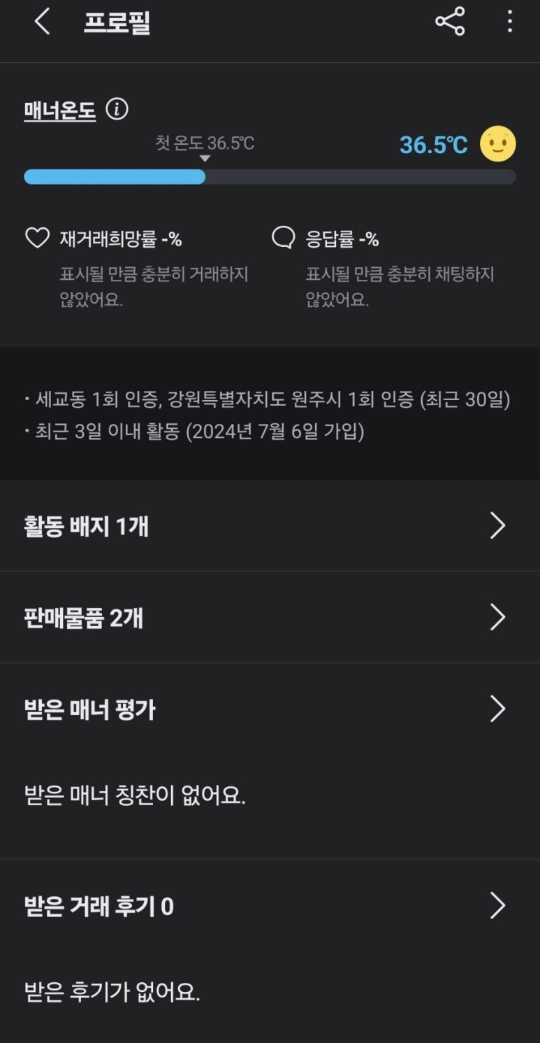 판매물품도 겨우 2개이고 받은 매너 평가가 없죠.