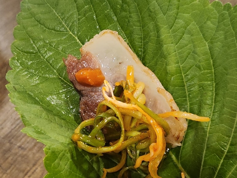 가장 먼저 깻잎에 싸서 맛있게 냠~~