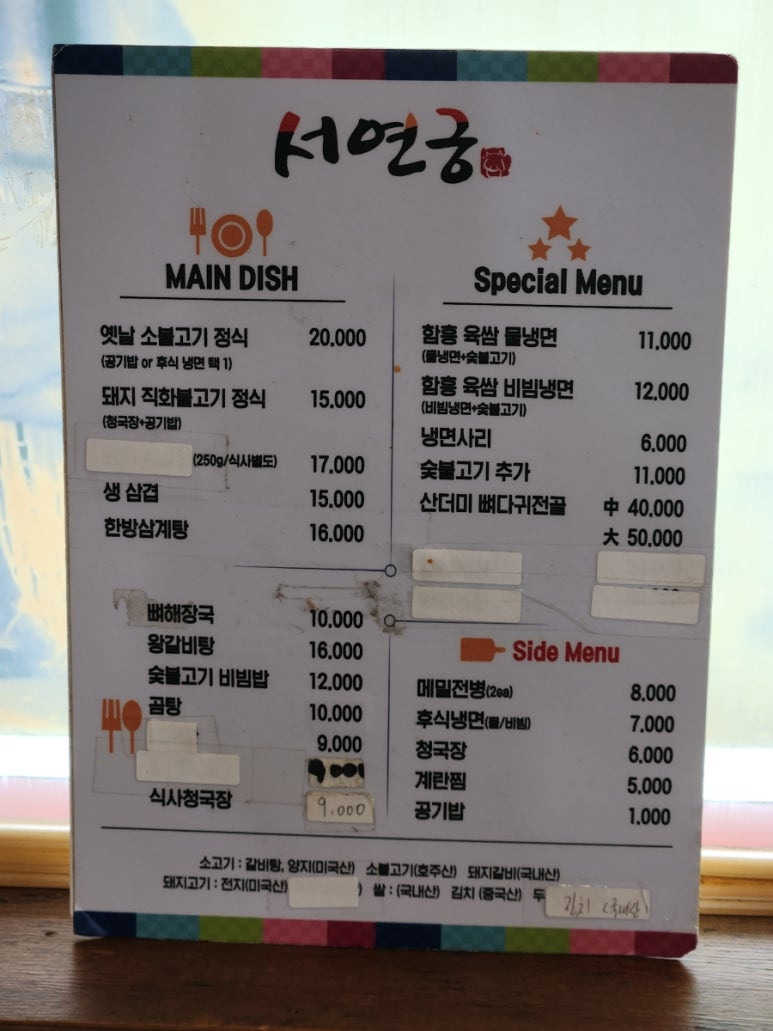 서연궁의 메뉴입니다.