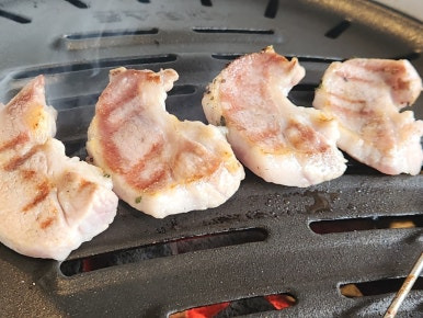 두툼한 삼겹살이 노릇노릇 잘 구워지고 있죠?