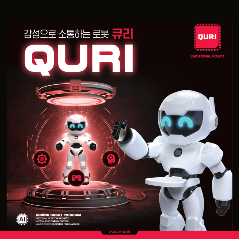 감성으로 소통하는 호기심 많은 휴머노이드 로봇, 코딩아이 ‘큐리(QURI)’ 주목!유아 코딩 교육 전문 브랜드 ‘코딩아이’가 아이들의 감성 지능과 논리적 사고력을 동시에 키워줄 신제품 휴머노이드 로봇 ‘큐리(QURI)’를 선보였습니다. 큐리는 단순한 조작을 넘어 아이들과 교감하며 놀이처럼 코딩을 배울 수 있는 혁신적인 교육용 로봇이에요.다채로운 표정과 대화로 나누는 ‘감성 교감’큐리의 가장 큰 매력은 로봇과 사용자가 ‘친구’처럼 소통할 수 있다는 점입니다. 눈에 장착된 LED를 통해 사랑, 궁금함, 무서움, 화남, 슬픔, 놀람, 기쁨 등 총 7가지 감정을 직관적으로 표현해요.또한 머리의 터치 센서에 손을 대면 “내 친구가 되어줘서 고마워”, “정말 잘했어! 너 정말 멋지다!” 같은 따뜻한 멘트로..