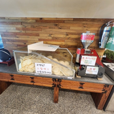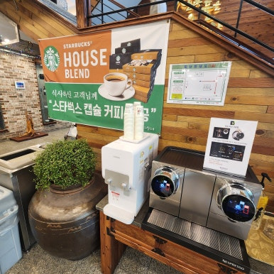 - 이곳에 뻥튀기 간식이 있고, 식사 후에는 스타벅스 캡슐커피도 마실 수 있습니다.