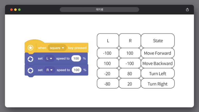 그래서 왼쪽 -40 / 오른쪽 40처럼 쓰면 직진이 되는 거죠.