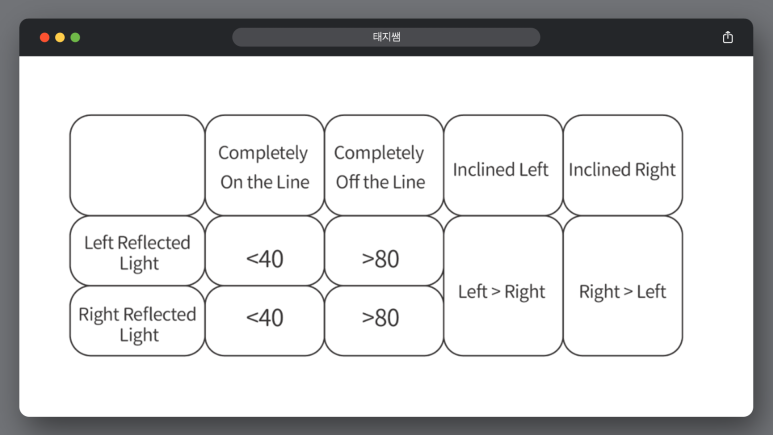 - 두 센서 모두 라인에서 벗어남(흰색) → 후진(혹은 탐색 동작)