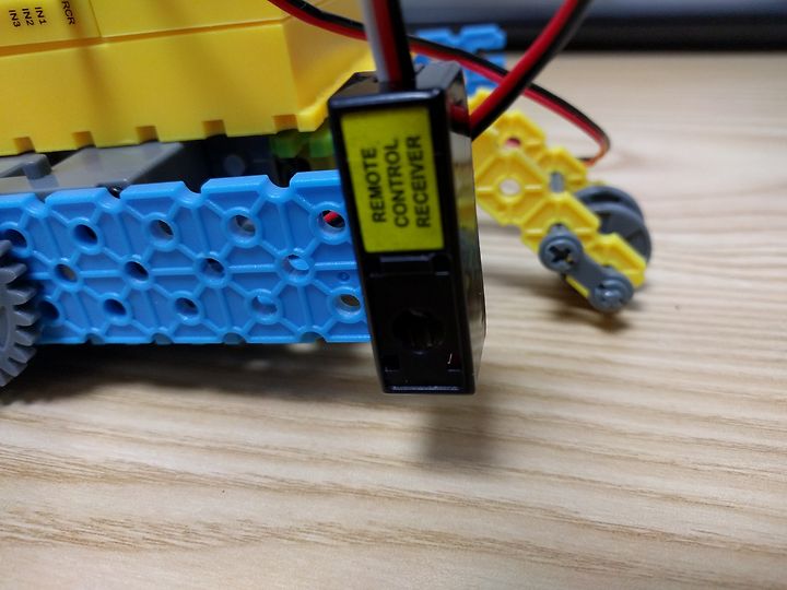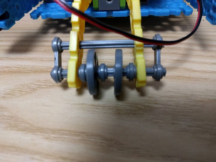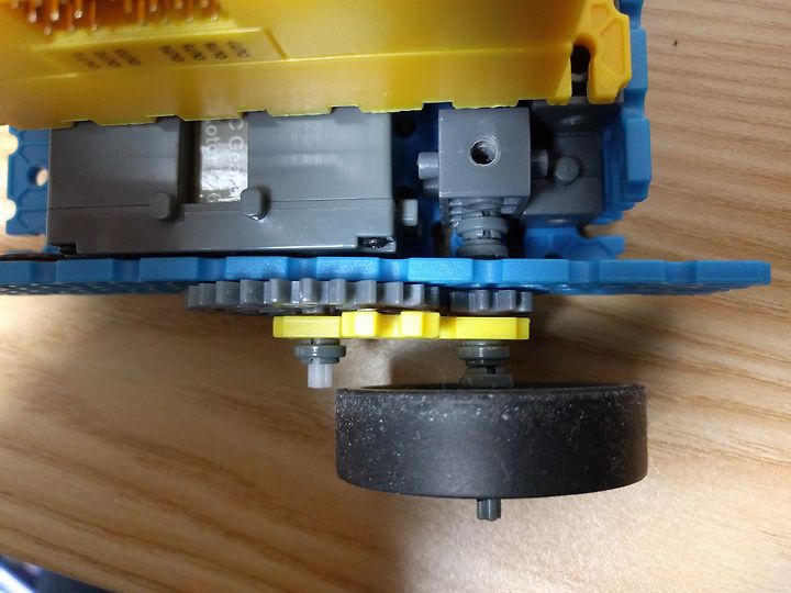 뒷부분 모터엔 큰 기어가 바퀴엔 작은 기어가 연결되어 있고 톱니의 갯수가 3배 차이가 나고, 결과적으로 회전속도가 3배 빨라집니다.