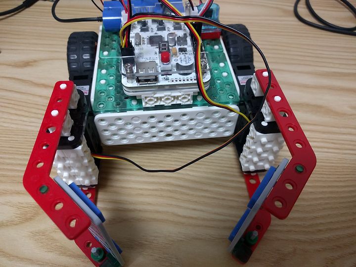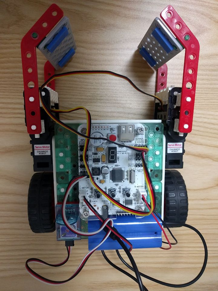 앞엔 두개의 서보모터에 굴절프레임을 연결해서 물건을 잡기에 유리한 형상으로 만들어졌어요.